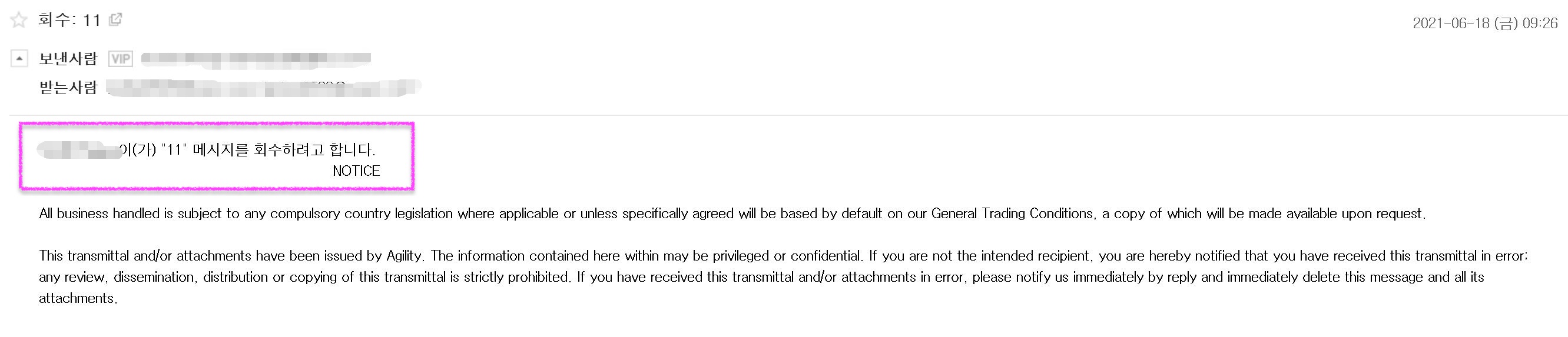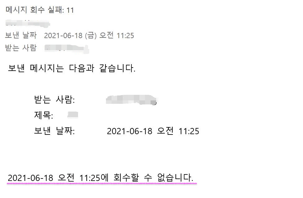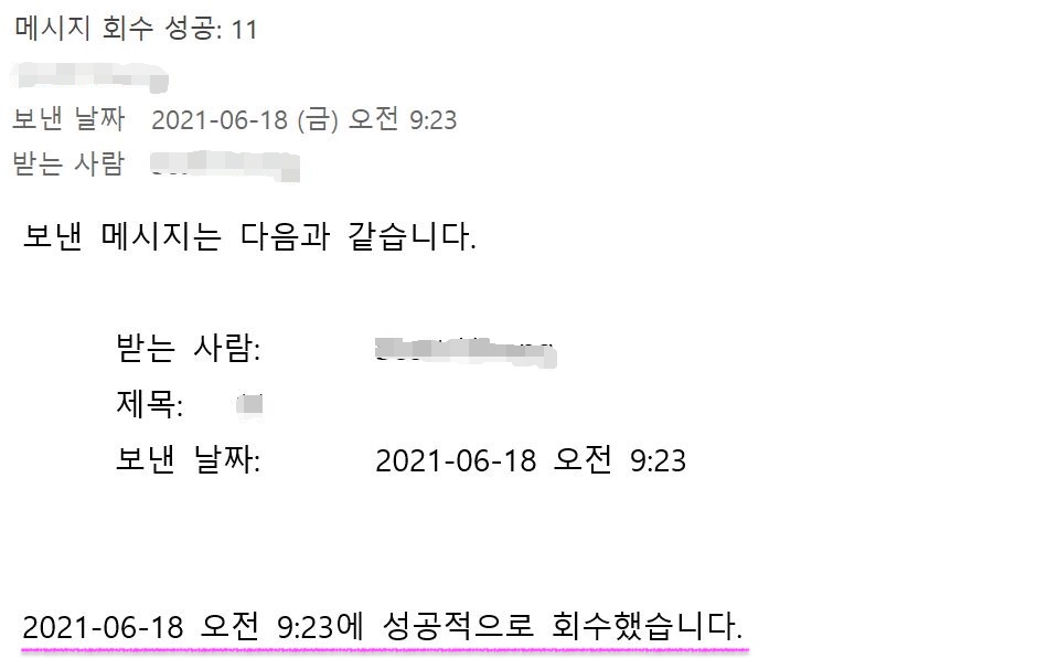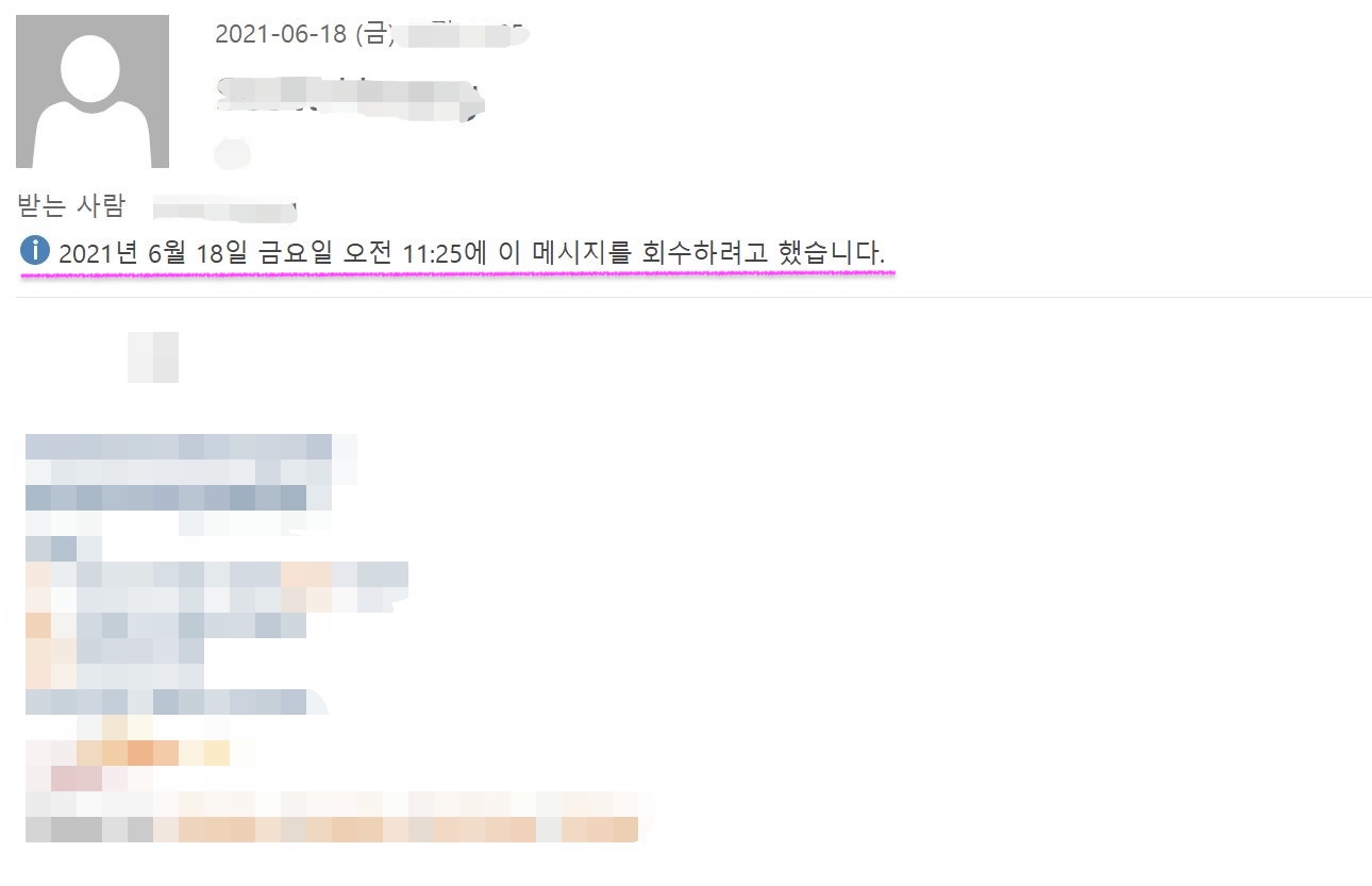메일 삭제 요청을 하면 전송한 메일에 "XXXX 년 X월 X일 X요일 오전 0:00에 이 메시지를 회수하려고 했습니다."라는 문구가 표시됩니다.