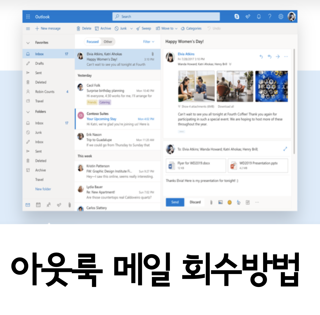 직장인 분들이 회사에서 많이 사용하는 메일이 바로 아웃룩 Outlook인데요. 이번 포스팅에서는 아웃룩 기능 중에서 보낸 메일 회수하는 방법에 대해 알아보도록 하겠습니다.메일을 쓰다 보면 작성 도중 메일이 보내지거나 넣지 말아야 할 내용을 보내는 경우가 종종 있으신데요. 이런 상황이 발생하였을 때는 아웃룩에서 메시지 회수 기능을 활용하시면 되겠습니다.