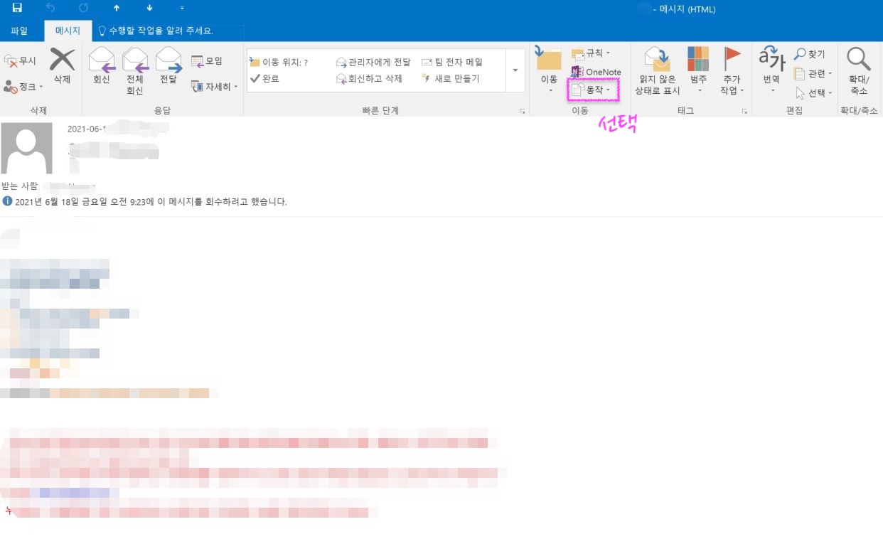 상단 메뉴바에서 동작 ▷ 메시지 회수 순으로 눌러줍니다. 메세지 기능을 통하여 발송한 메일을 회수할 수 있습니다.