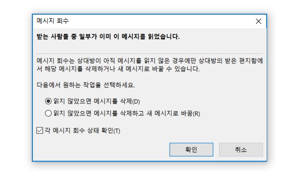 해당 기능을 통해서 보낸 메일을 삭제하거나 새 메일로 바꿀 수 있습니다. 단, 상대방이 아직 메일을 읽지 않은 경우에만 가능하니 참고하시길 바랍니다.
