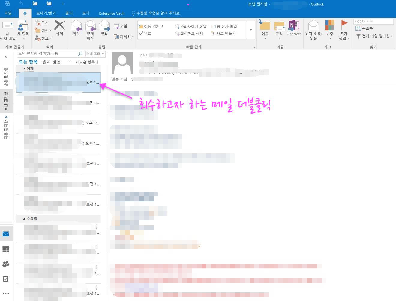 보낸 메일 회수하는 방법은 다음과 같은데요. 우선 보낸 편지함에서 회수하고자 하는 메일을 더블클릭을 해줍니다.