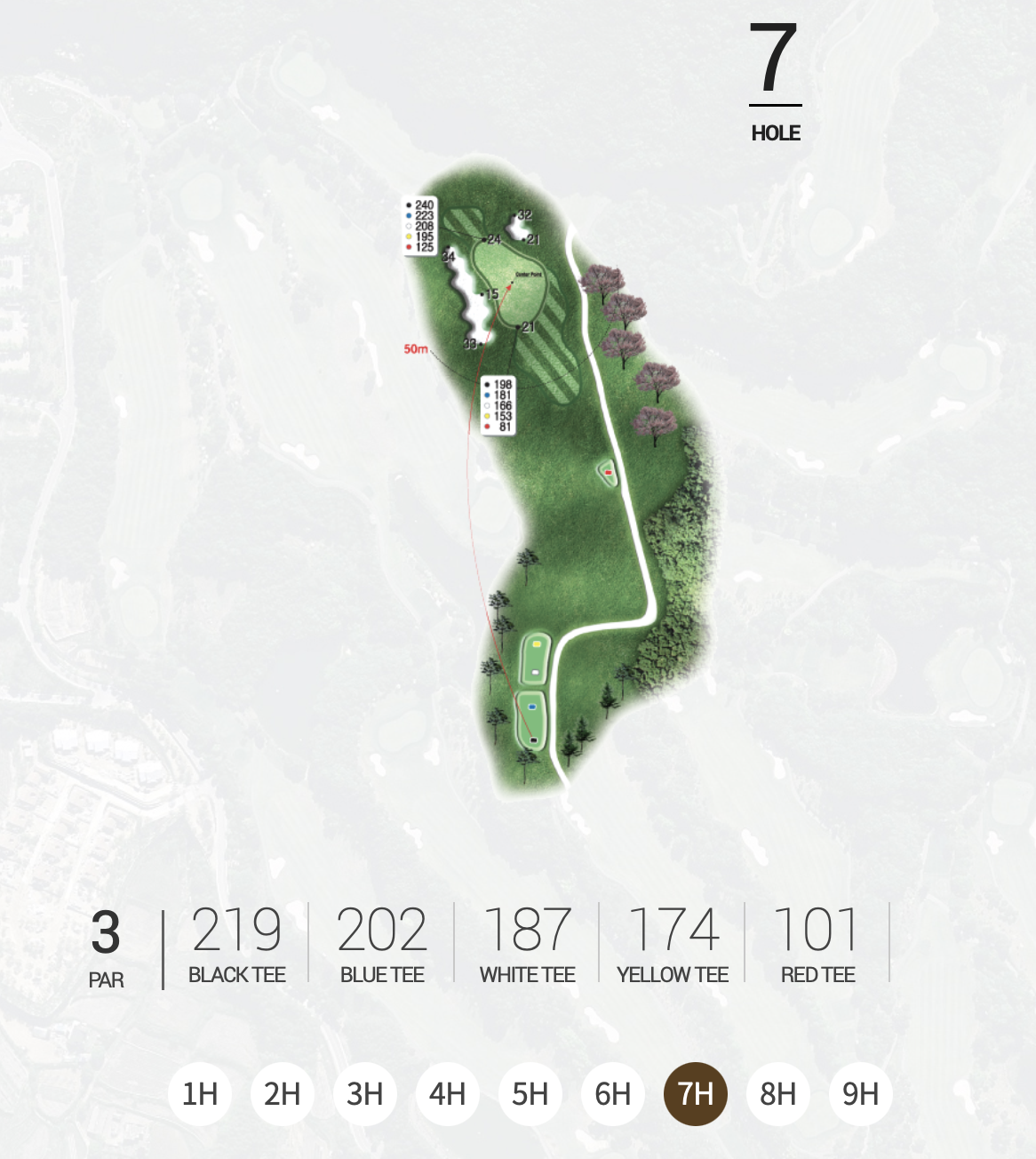 난이도 같은 경우 중~상급에 속한다고 한다. 산속에 위치해 있어서 울퉁불퉁한 지형들이 꽤 많고 페어웨어 역시 넓어졌다 좁아졌다를 반복한다고 한다. 대부분의 Par5 홀은 그린까지 거리가 매우 멀거나 해저드와 벙커가 양 사이드에 교묘하게 위치해 있어 투온 하기에는 힘들다고 한다.