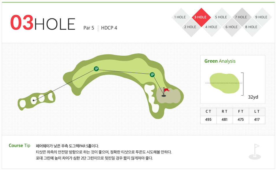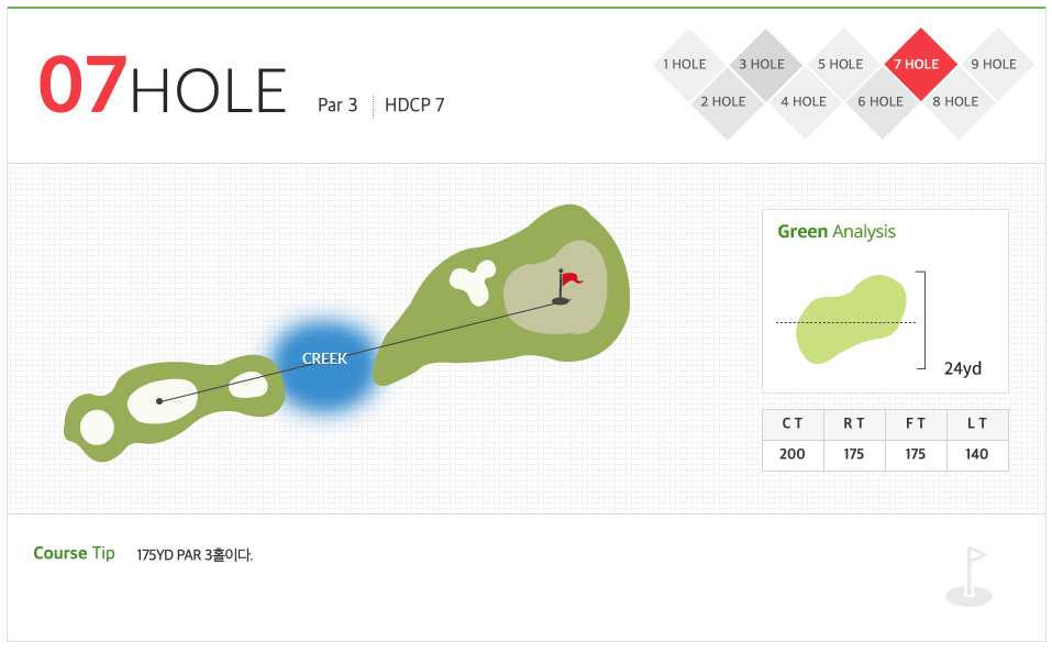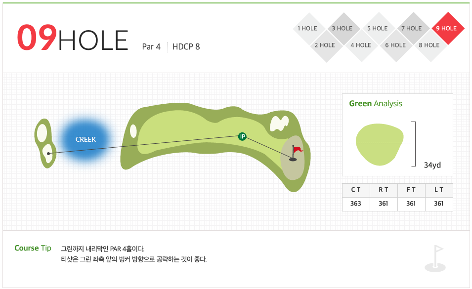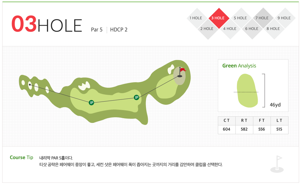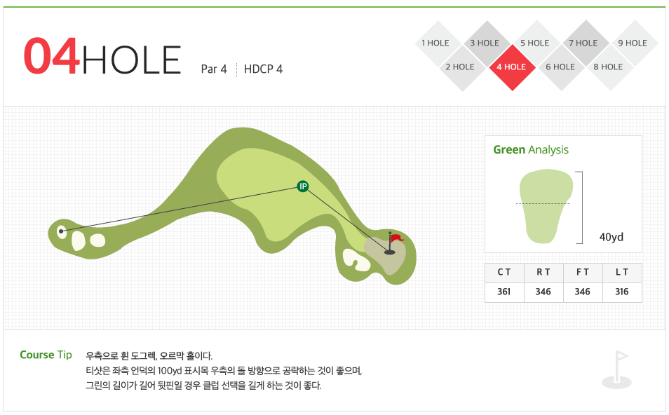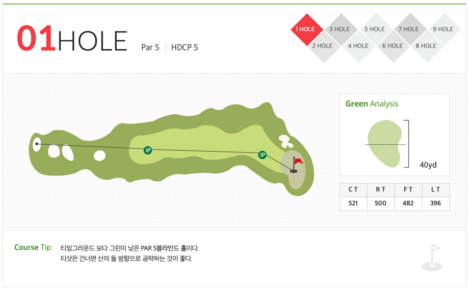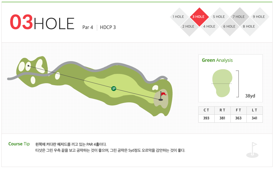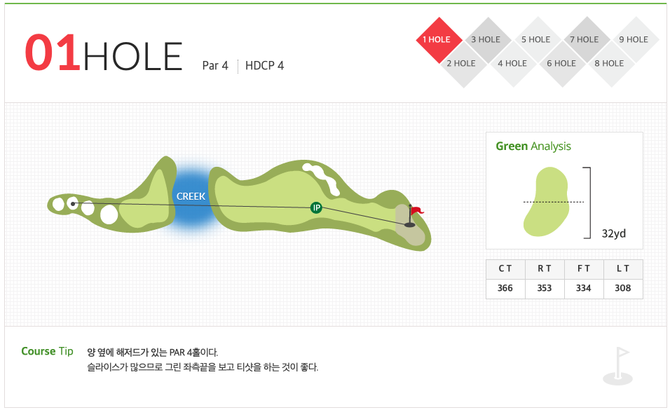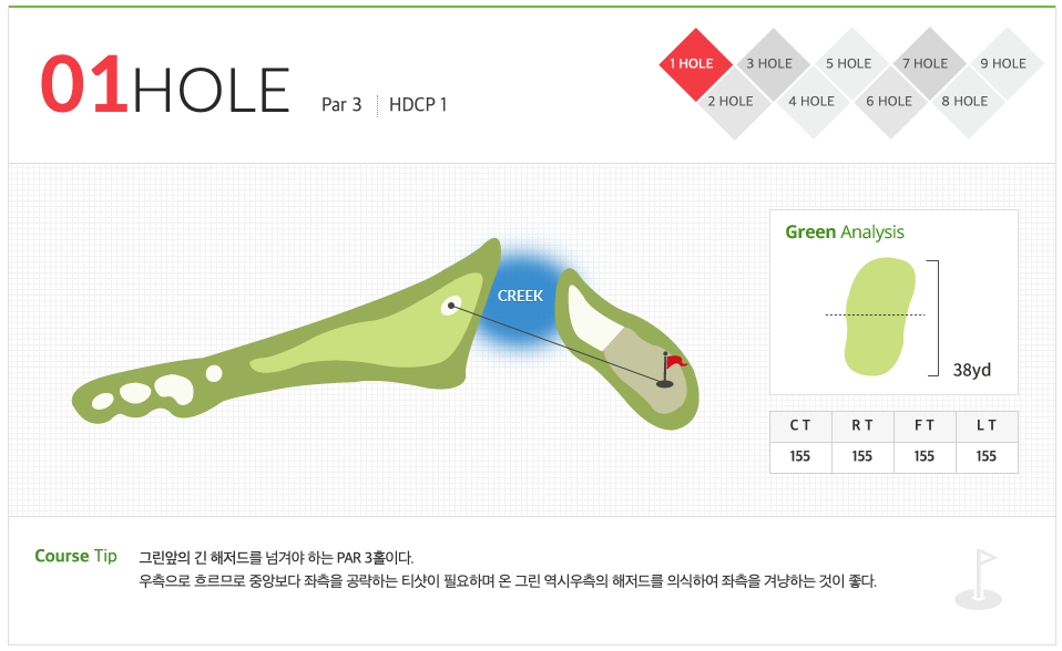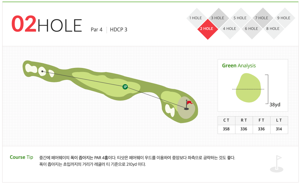 중원CC에는 특징이 뚜렷한 3개의 코스로 구성되어 있는데요. 각 코스명칭은 고구려, 신라, 백제 이름을 따서 만들어졌습니다. 고구려는 도전적이고 활달하고, 백제는 담담하면서 온화하고, 신라는 풍류와 산수를 느낄 수 있는 코스입니다. 각 코스별 정보와 공략팁은 아래와 같습니다.