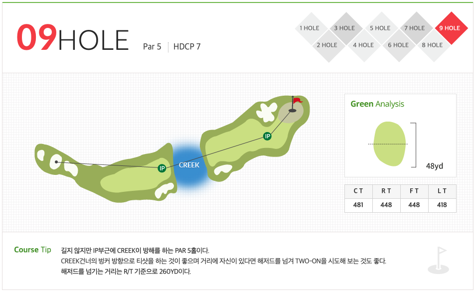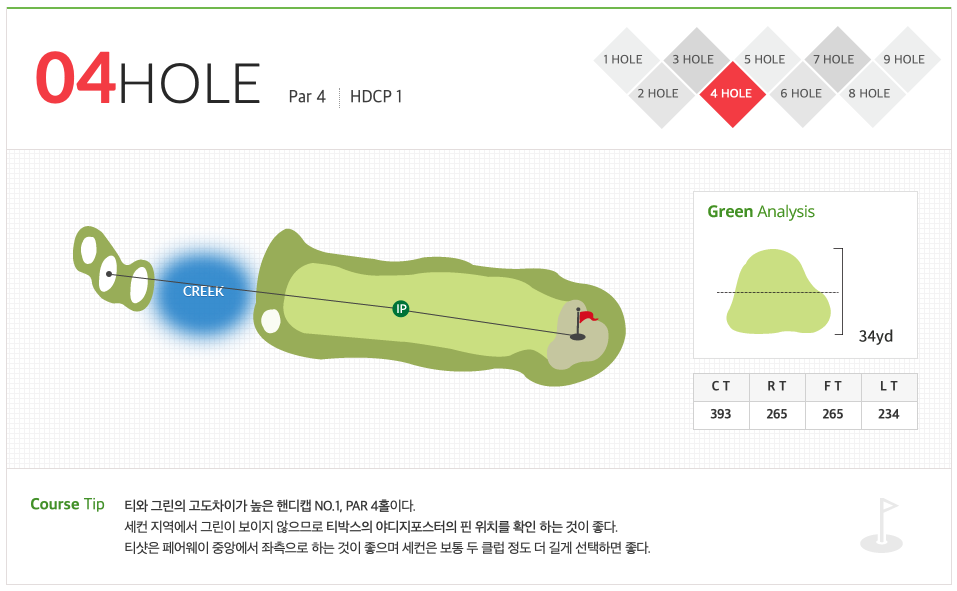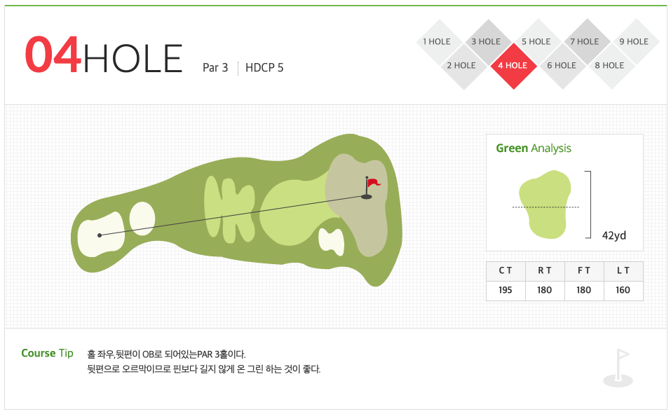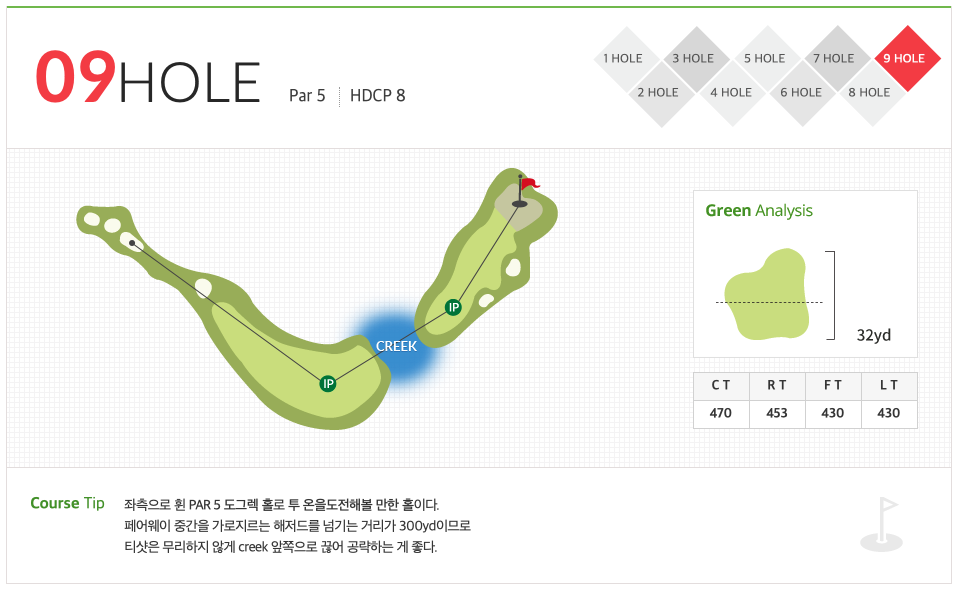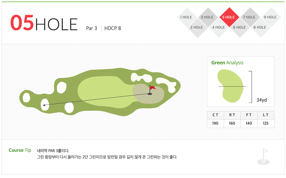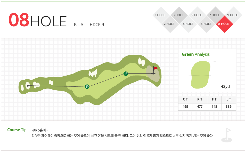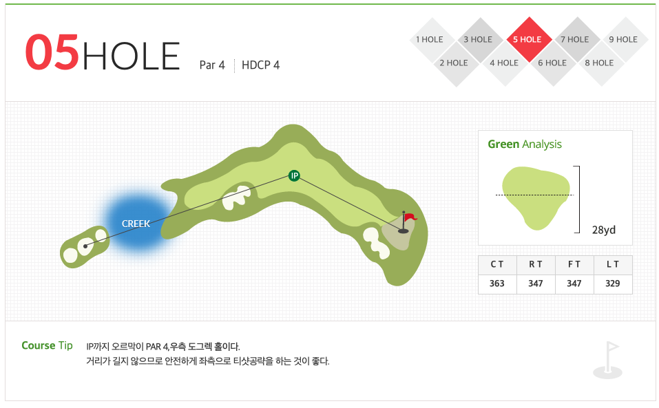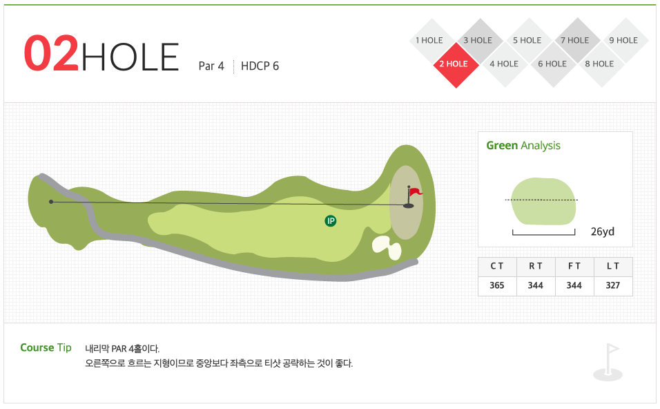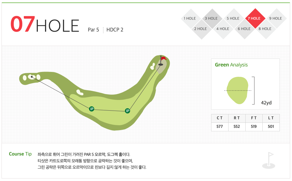 중원CC에는 특징이 뚜렷한 3개의 코스로 구성되어 있는데요. 각 코스명칭은 고구려, 신라, 백제 이름을 따서 만들어졌습니다. 고구려는 도전적이고 활달하고, 백제는 담담하면서 온화하고, 신라는 풍류와 산수를 느낄 수 있는 코스입니다. 각 코스별 정보와 공략팁은 아래와 같습니다.