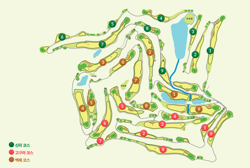 많은 분들이 백제 - 신라 - 고구려 순으로 선호한다고 하는데요. 백제는 3개 코스 중 가장 편안한 느낌으로 플레이할 수 있는 코스라고 합니다. 반면 고구려는 페어웨이가 좁은 편으로 보다 정확한 티샷이 요구된다고 합니다. 신라는 파 5홀이 3개로 구성되어 있어 장타자들에게는 선호도 높은 코스라고 합니다.