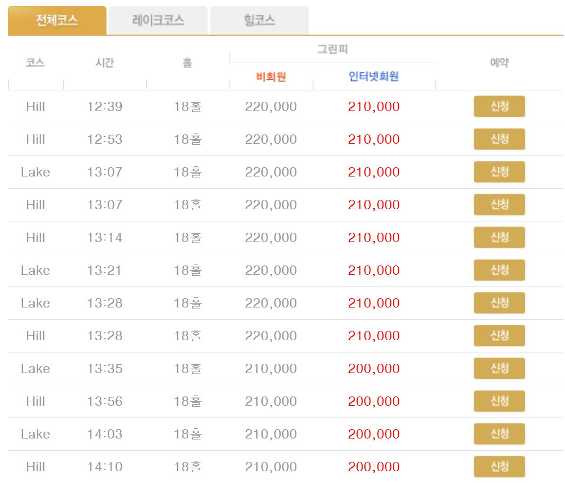 그린피 이용요금 같은 경우에는 과거만큼 메리트 있는 가격대는 아니지만 수도권 골프장에 비하면 나름 저렴한 편입니다. 요금은 비회원 기준 평일은 약 16만 원대이고 주말은 약 21만 원대입니다. 예약 날짜 및 시간에 따라 그린피 요금이 변동될 수 있습니다.