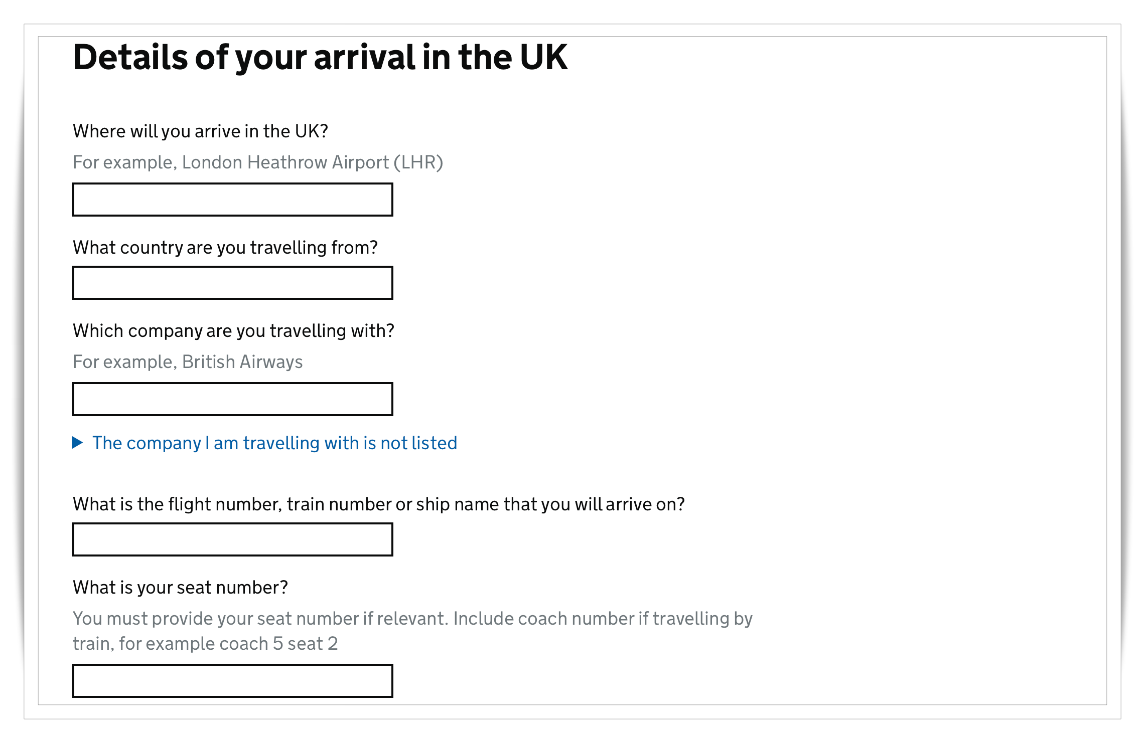 다음은 영국 도착 정보를 기재하시면 됩니다. 영국 어느 공항에 도착하는지, 어느 국가에서 오는지, 어느 항공사를 이용하는지, 항공편 번호와 좌석 정보를 입력하시면 됩니다. 아직 좌석번호를 알지 못하는 경우에는 별도로 기재하지 않고 다음 단계로 넘어가시면 됩니다.