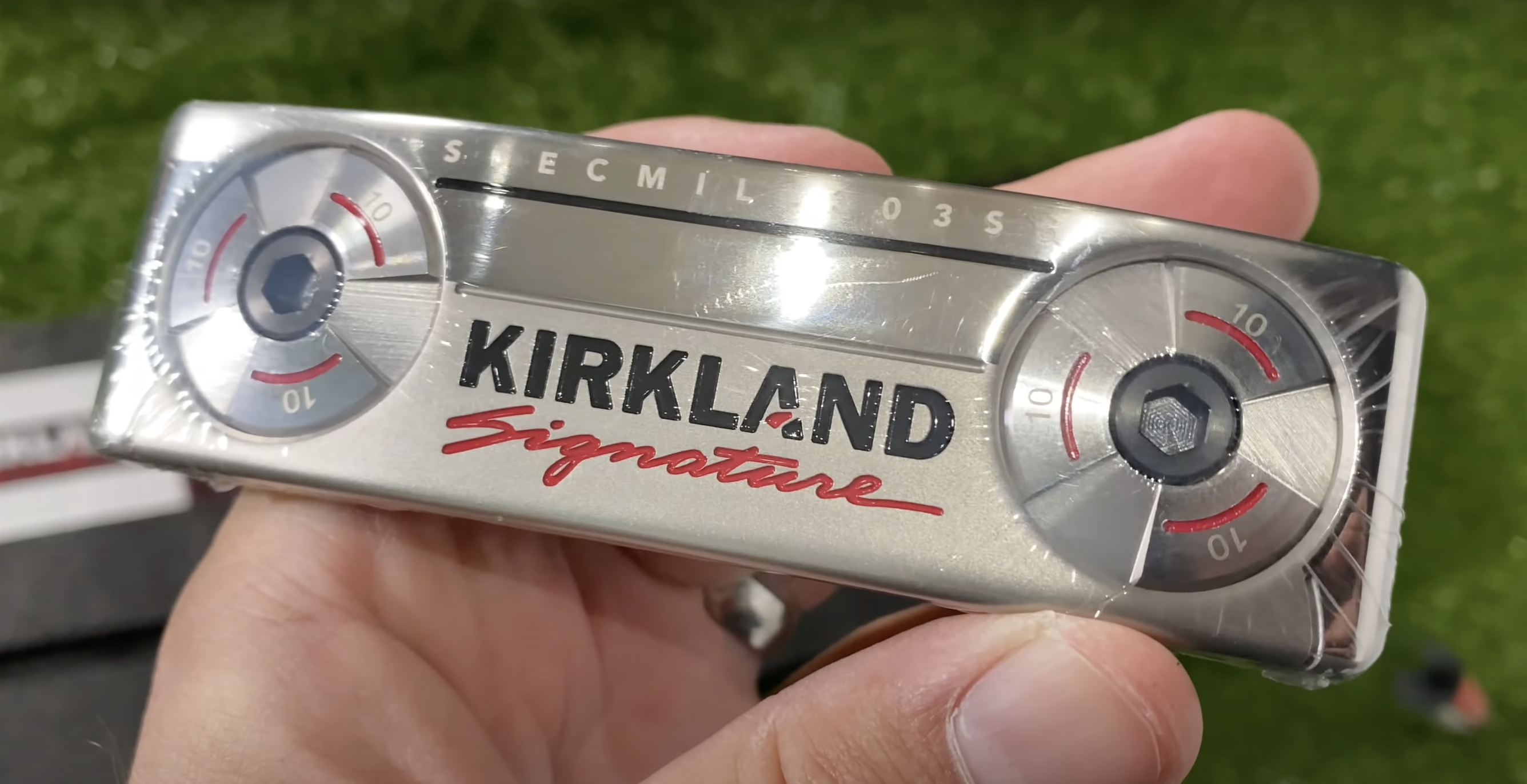 해드 하단 부분에는 303 스테인레스로 만들어졌다는 로고 표시와 커클랜드 시그니처 문구가 박혀있죠. 그리고 양 좌우측에는 헤드 무게를 조절할 수 있는 무게추가 위치해 있습니다. 언듯 보면 타이틀리스트 스카티카메룬 퍼터와 비슷하다고 느끼실 수 있습니다.