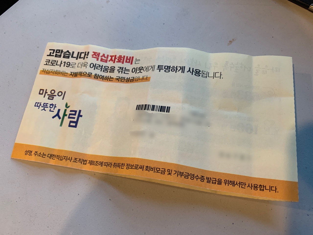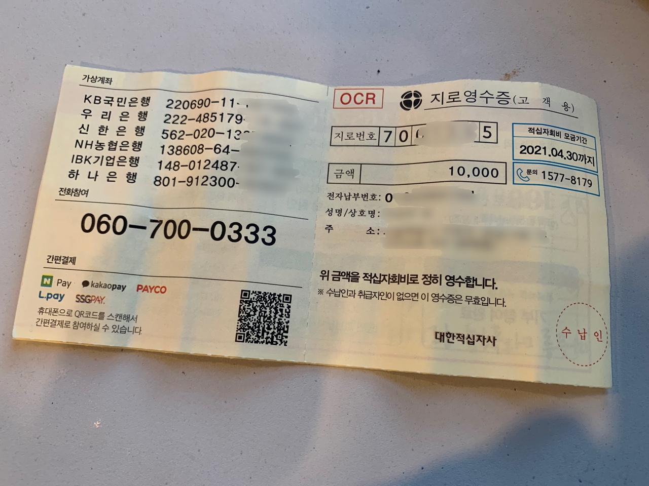 얼마 전 저 역시 적십자회비 지로용지를 받았는데요. 월말 공과금 비용으로 인지하여 납부할 뻔했습니다. 하지만 용지를 자세히 보니 '위 금액을 적십자회비로 정히 영수합니다'라는 글이 적혀 있더군요. 즉, 해당 지로용지는 대한적십자에서 회비 모금을 위해 발급한 영수증이었던 것이었습니다.